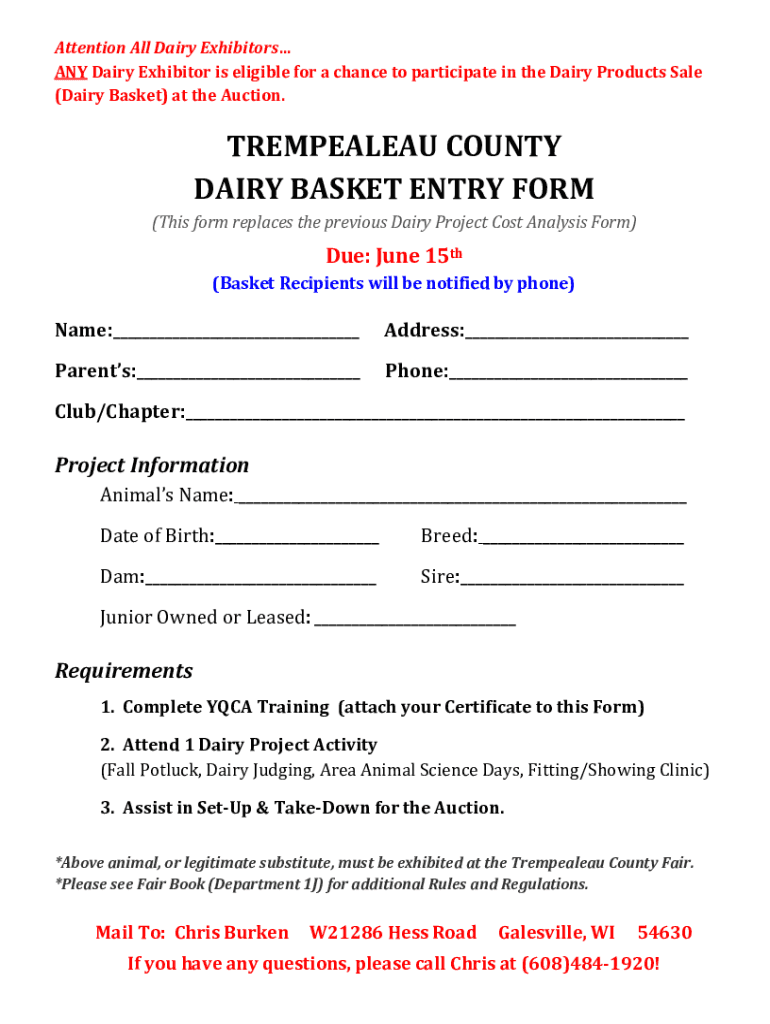 Attention All Dairy Exhibitors ANY Dairy Exhibitor is eligible for a chance to participate in the Dairy Products Sale (Dairy Basket) at the Auction.TREMPEALEAU COUNTY DAIRY BASKET ENTRY FORM (This