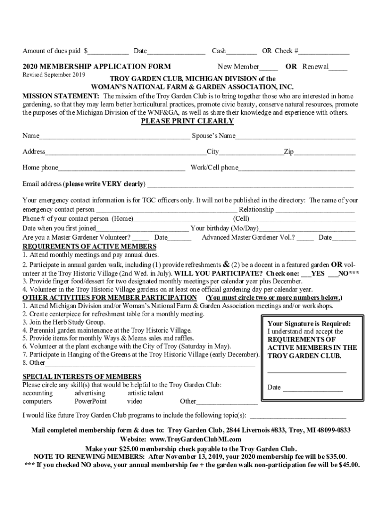 Amount of dues paid $ Date Cash OR Check # 2020 MEMBERSHIP APPLICATION FORM Revised September 2019New Member OR Renewal TROY GARDEN CLUB, MICHIGAN DIVISION of the WOMAN NATIONAL FARM & GARDEN ASSOCIATION,