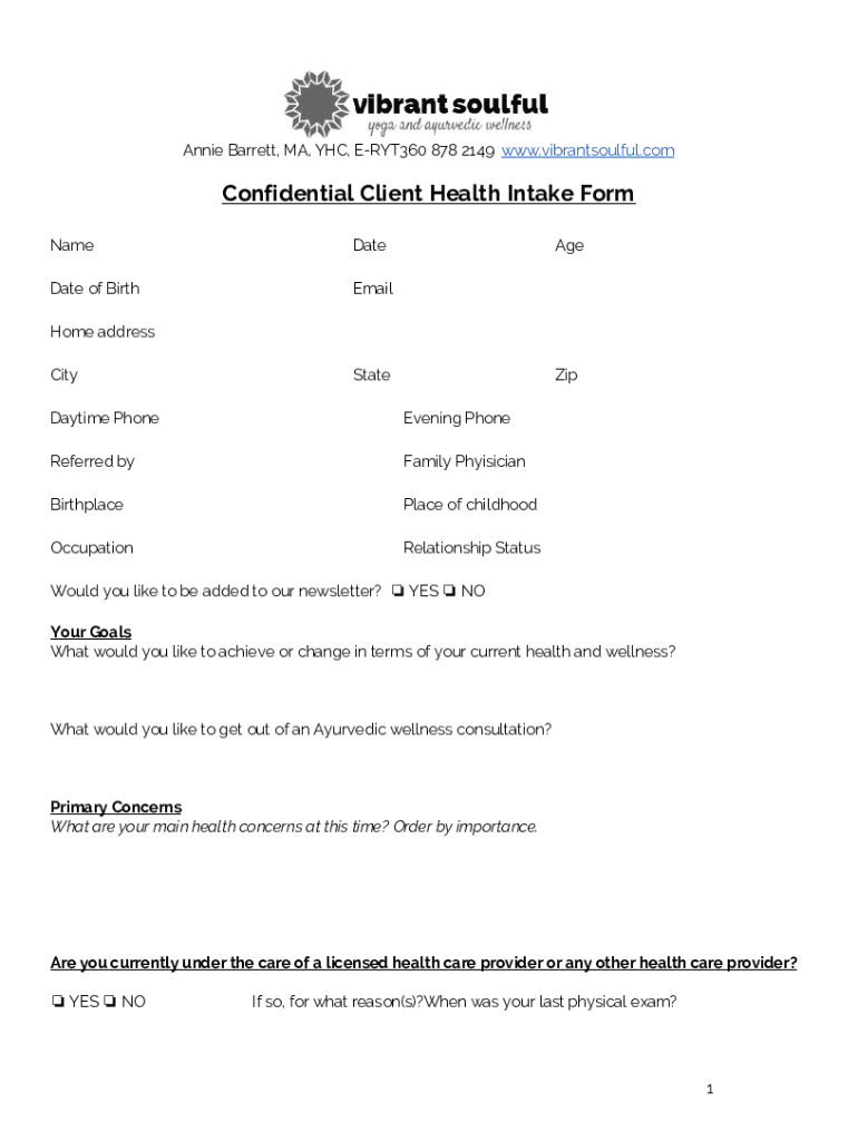 Annie Barrett, MA, MHC, ERYT360 878 2149 www.vibrantsoulful.com Confidential Client Health Intake Form NameDateAge Date of Birth Email Home address City State Zip Daytime Phone Evening Phone Referred