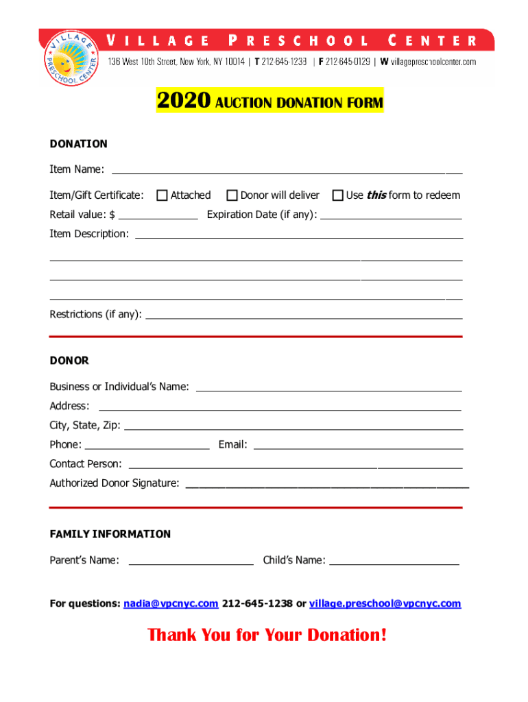 2020 AUCTION DONATION FORM DONATION Item Name: Item/Gift Certificate: Attached Donor will deliver Use this form to redeemRetail value: $ Expiration Date (if any): Item Description: Restrictions (if