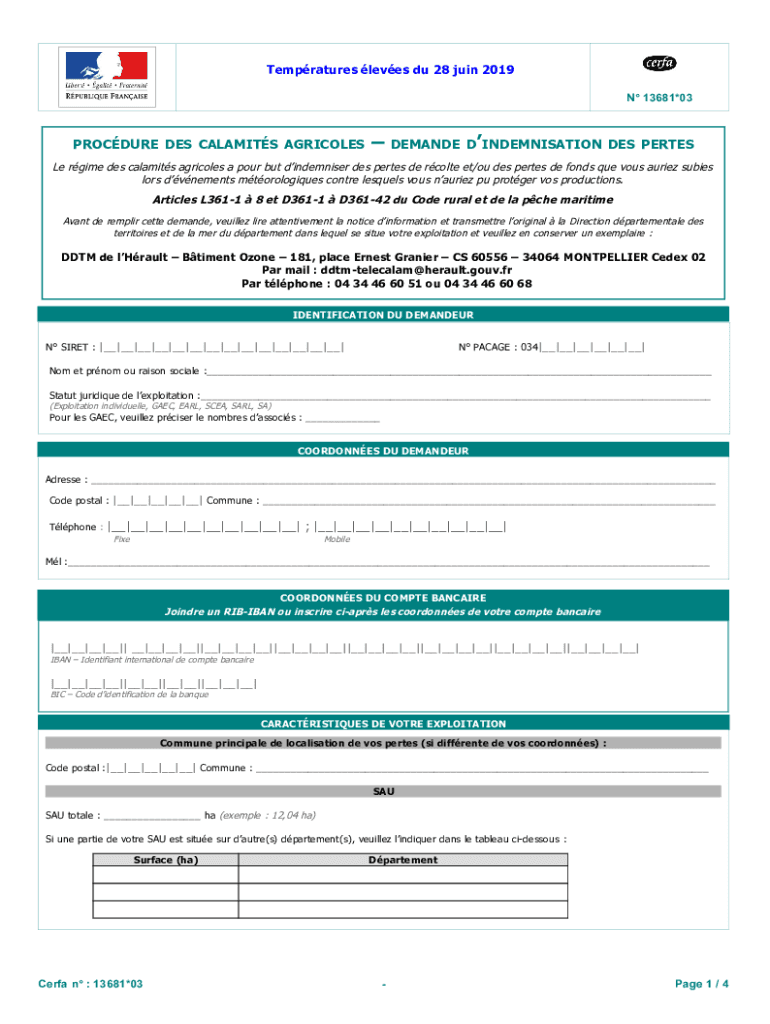 Temperatures level Du 28 join 2019 N 13681×03PROCDURE DES CALAMITY AGRICOLA DEMAND DINDEMNISATION DES Pertest regime DES calamity Agricola a pour but dindemniser DES perter DE role ET/of DES perter