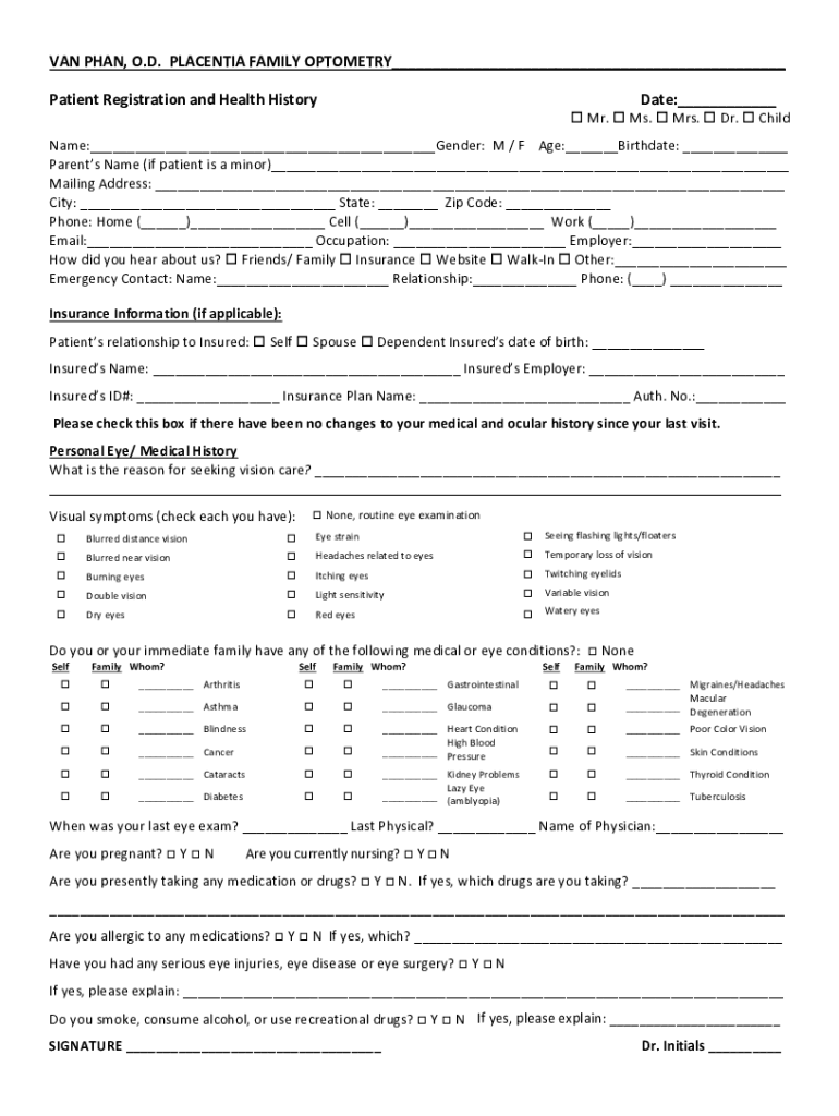 VAN THAN, O.D.PLACENTA FAMILY OPTOMETRY Patient Registration and Health HistoryDate: o Mr. o Ms. o Mrs. o Dr. o Childcare: Gender’M / FAGE: Birthdate: Parents Name (if patient is a minor) Mailing