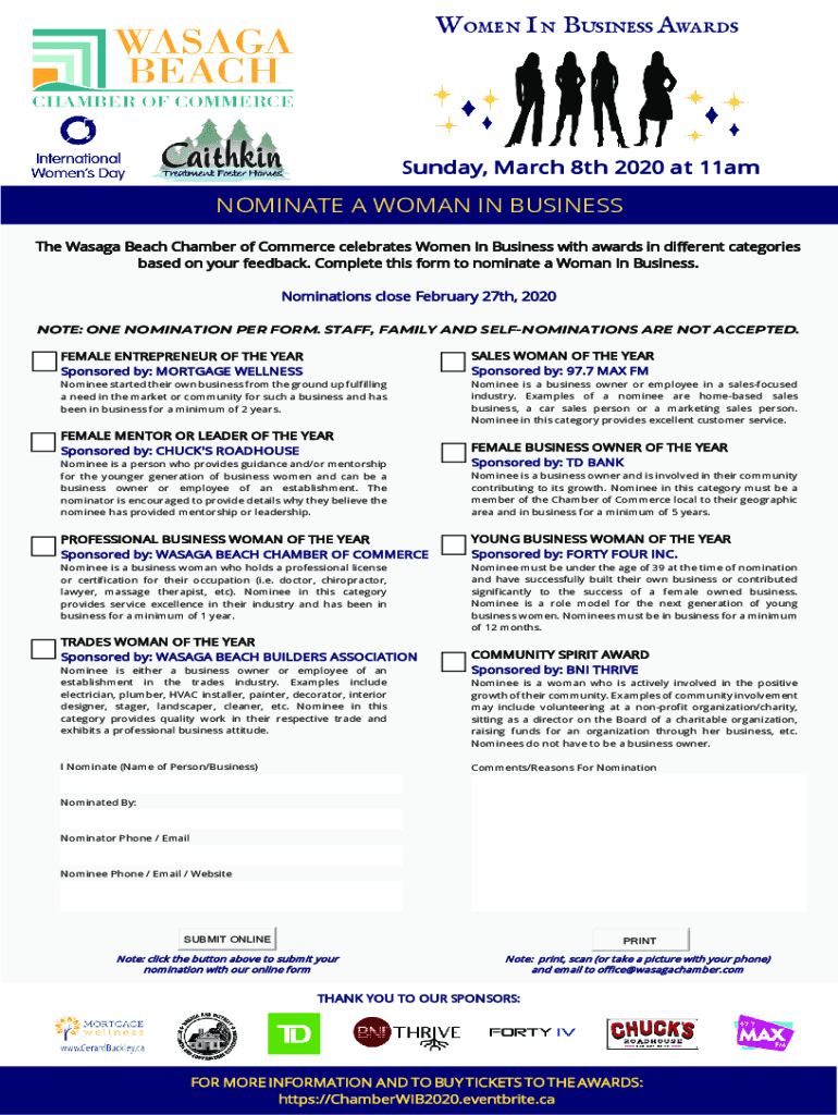 Women In Business Awards Sunday, March 8th 2020 at 11amNOMINATE A WOMAN IN BUSINESS