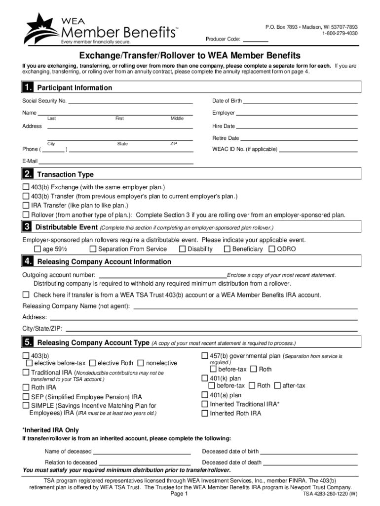 P.O. Box 7893 Madison, WI 537077893 18002794030 Producer Code:Exchange/Transfer/Rollover to WE Member Benefits If you are exchanging, transferring, or rolling over from more than one company, please