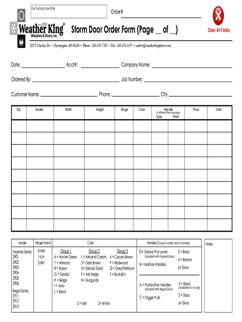 For Factory Use Onlooker#:Storm Door Order Form (Page of)Clear All Fields20775 Chesley Dr. Farmington, MI 48336 Phone: 2484787788 Fax: 2484781475 orders weatherkingdoors.combat:Acct#:Company Name:Ordered
