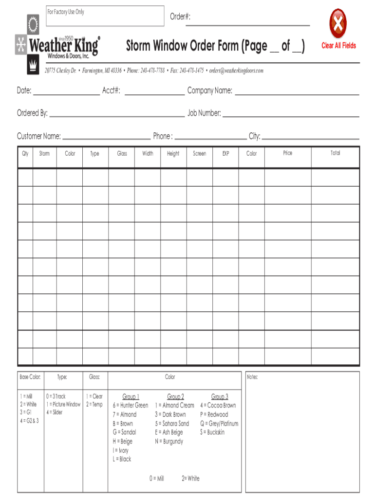 For Factory Use Onlooker#:Storm Window Order Form (Page of)Clear All Fields20775 Chesley Dr. Farmington, MI 48336 Phone: 2484787788 Fax: 2484781475 orders weatherkingdoors.combat:Acct#:Company Name:Ordered