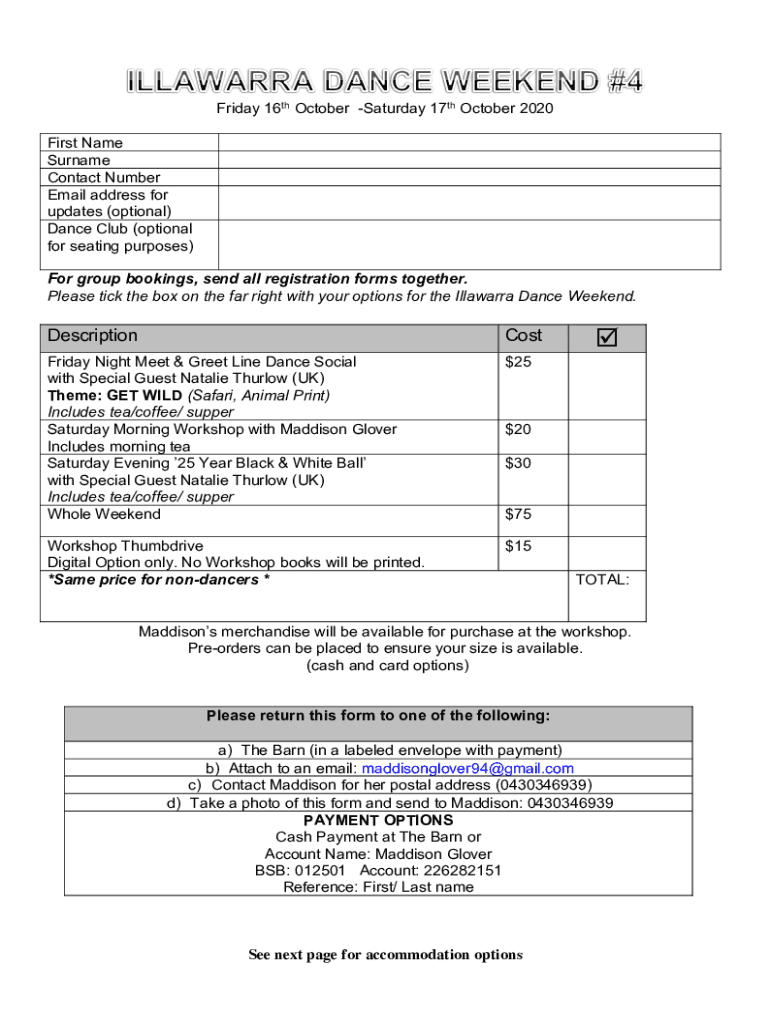 Friday 16th October Saturday 17th October 2020 First Name Surname Contact Number Email address for updates (optional) Dance Club (optional for seating purposes) For group bookings, send all registration