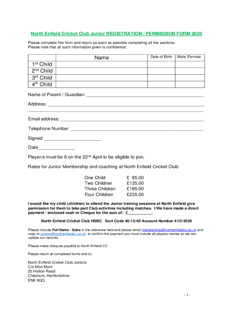 Get the free North Enfield Cricket Club Junior REGISTRATION / PERMISSION FORM 2020