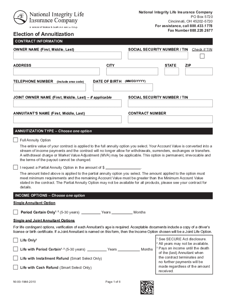 National Integrity Life Insurance Company PO Box 5720 Cincinnati, OH 452025720 For assistance, call 800.433.1778 Fax Number 888.220.2677Election of Annuitization CONTRACT INFORMATION OWNER NAME (First,