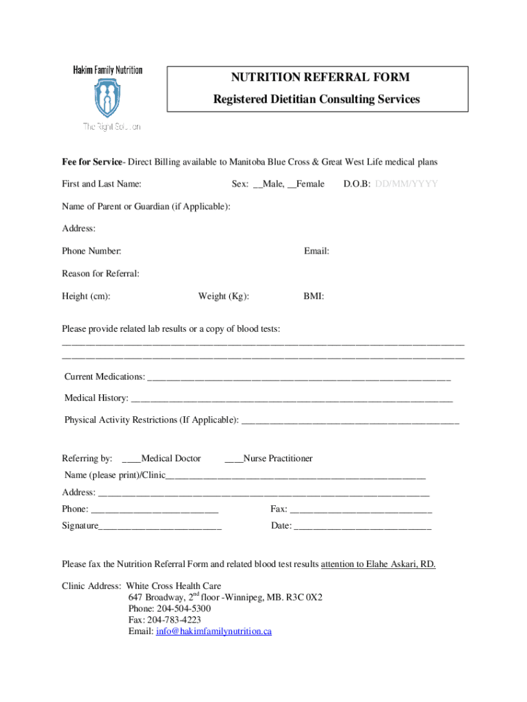 NUTRITION REFERRAL FORM Registered Dietitian Consulting Services for Service Direct Billing available to Manitoba Blue Cross & Great West Life medical plans First and Last Name:Sex: Male, Females.