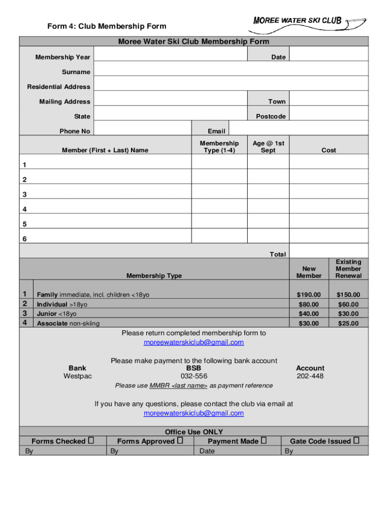 Form 4: Club Membership Form More Water Ski Club Membership Form Membership YearDateSurname Residential Address Mailing AddressTownStatePostcodePhone NoEmailMember (First + Last) NameMembership Type