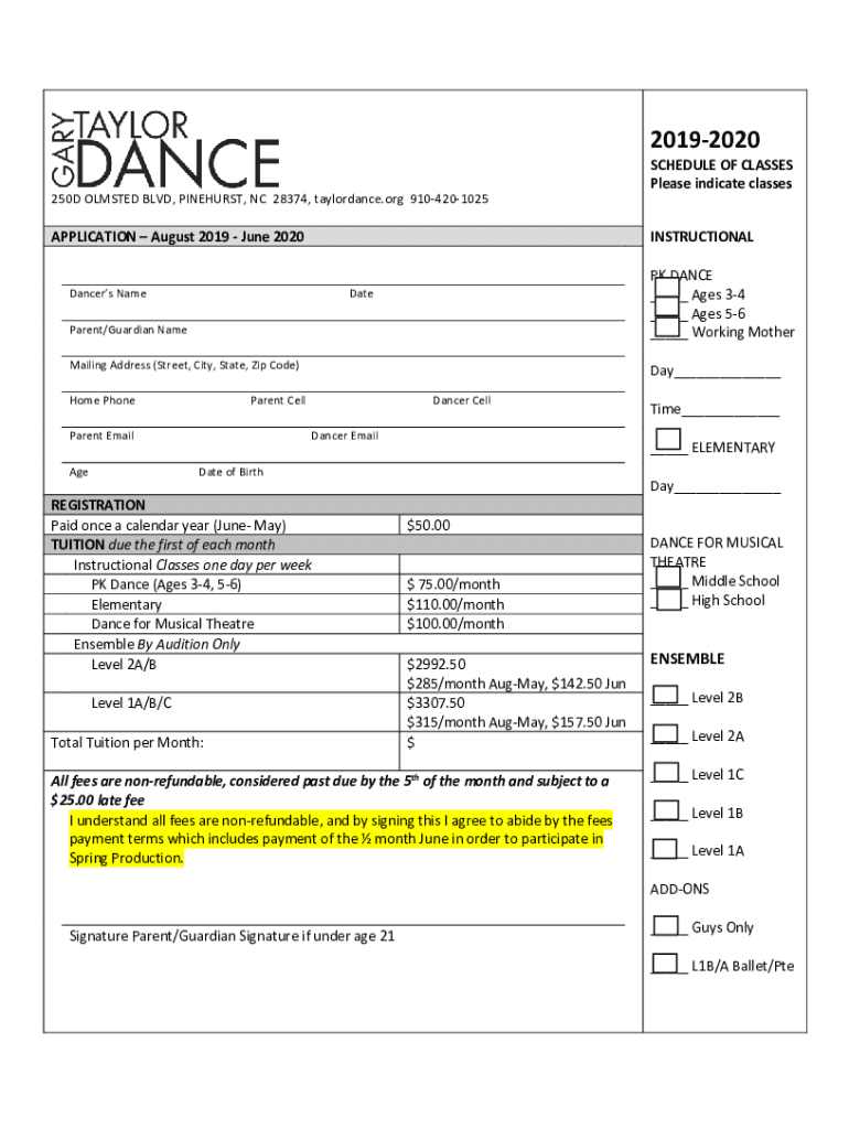 Essential information includes the child's name, parent/guardian name, mailing address, selected dance classes, and a signature from the parent/guardian to confirm understanding of the terms and conditions.