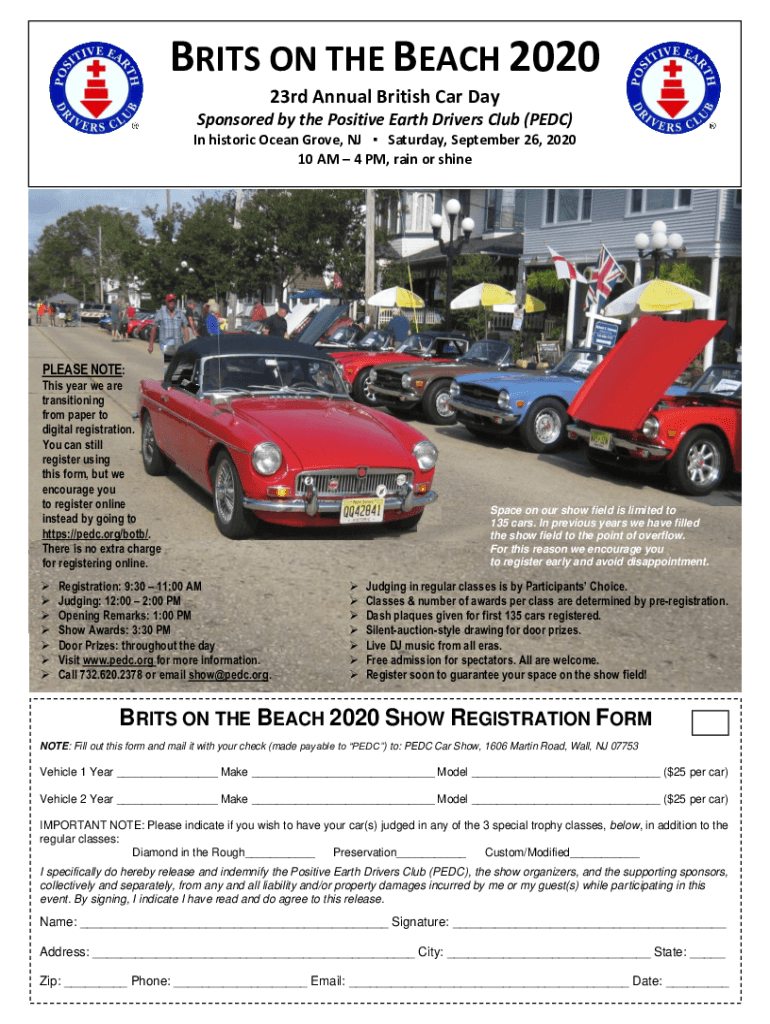 BRITS ON THE BEACH 2020 23rd Annual British Car Day Sponsored by the Positive Earth Drivers Club (EDC) In historic Ocean Grove, NJ Saturday, September 26, 2020 10 AM 4 PM, rain or shinePLEASE NOTE:This