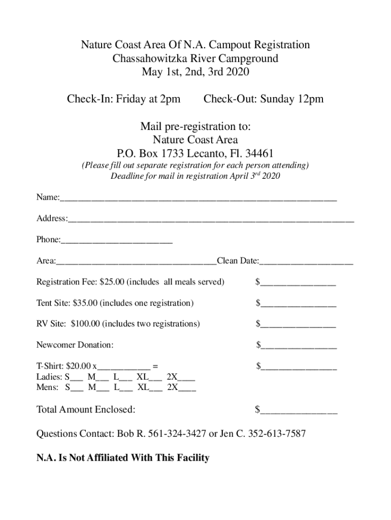Nature Coast Area Of N.A. Campout Registration Chassahowitzka River Campground May 1st, 2nd, 3rd 2020 Checking: Friday at 2pmCheckOut: Sunday 12pmMail preregistration to: Nature Coast Area P.O. Box