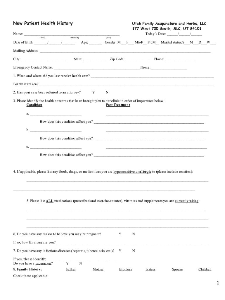New Patient Health History Name: (first)(middle)Date of Birth: / / Utah Family Acupuncture and Herbs, LLC 177 West 700 South, SLC, UT 84101 Today's Date: / / (last)Age: Gender: M F MTBF From Marital
