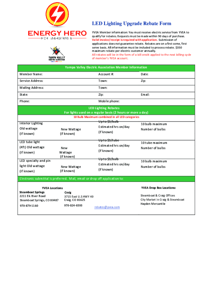 To fill out the LED lighting upgrade rebate, you generally need to complete an application form provided by the rebate program. This includes providing details about the lighting installation, the costs incurred, and any supporting documentation such as invoices and receipts.