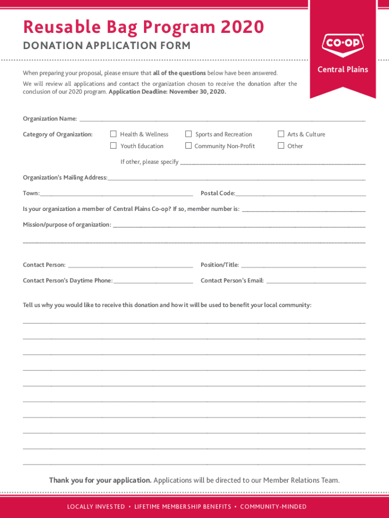 Reusable Bag Program 2020 DONATION APPLICATION FORM Central Plainsmen preparing your proposal, please ensure that all the questions below have been answered. We will review all applications and contact