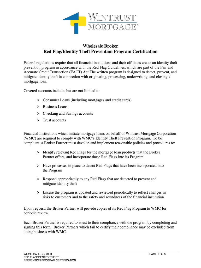 Wholesale brokers working with Wintrust Mortgage are the primary audience required to complete the Red Flag Identity Theft Prevention Program Certification. All broker roles involved in the mortgage lending process must comply with these requirements to protect consumers and maintain the integrity of their operations.