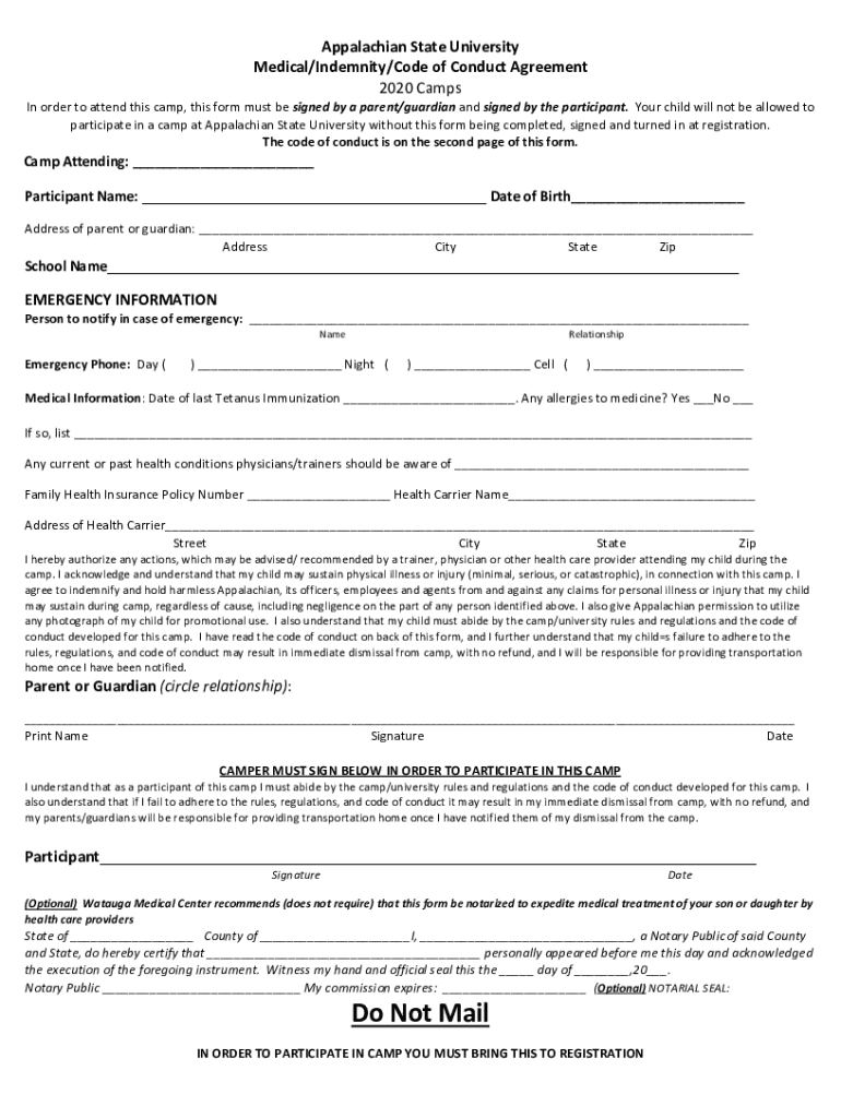Appalachian State University Medical/Indemnity/Code of Conduct Agreement 2020 Camps In order to attend this camp, this form must be signed by a parent/guardian and signed by the participant. Your