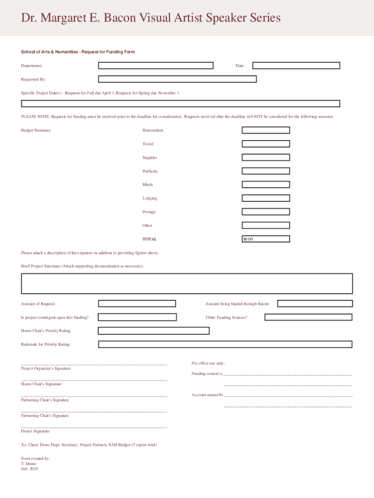 Dr. Margaret E. Bacon Visual Artist Speaker Series School of Arts & Humanities Request for Funding Form Department:Date:Requested By: Specific Project Date(s) Requests for Fall due April 1; Requests