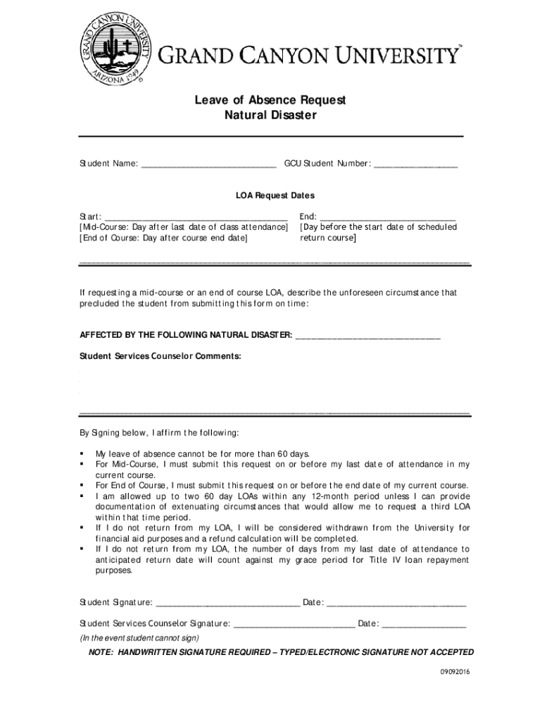 Leave of Absence Request Natural DisasterStudent Name: GCU Student Number: LOA Request Dates Start: Mid-course: Day after last date of class attendance End of Course: Day after course end date End: