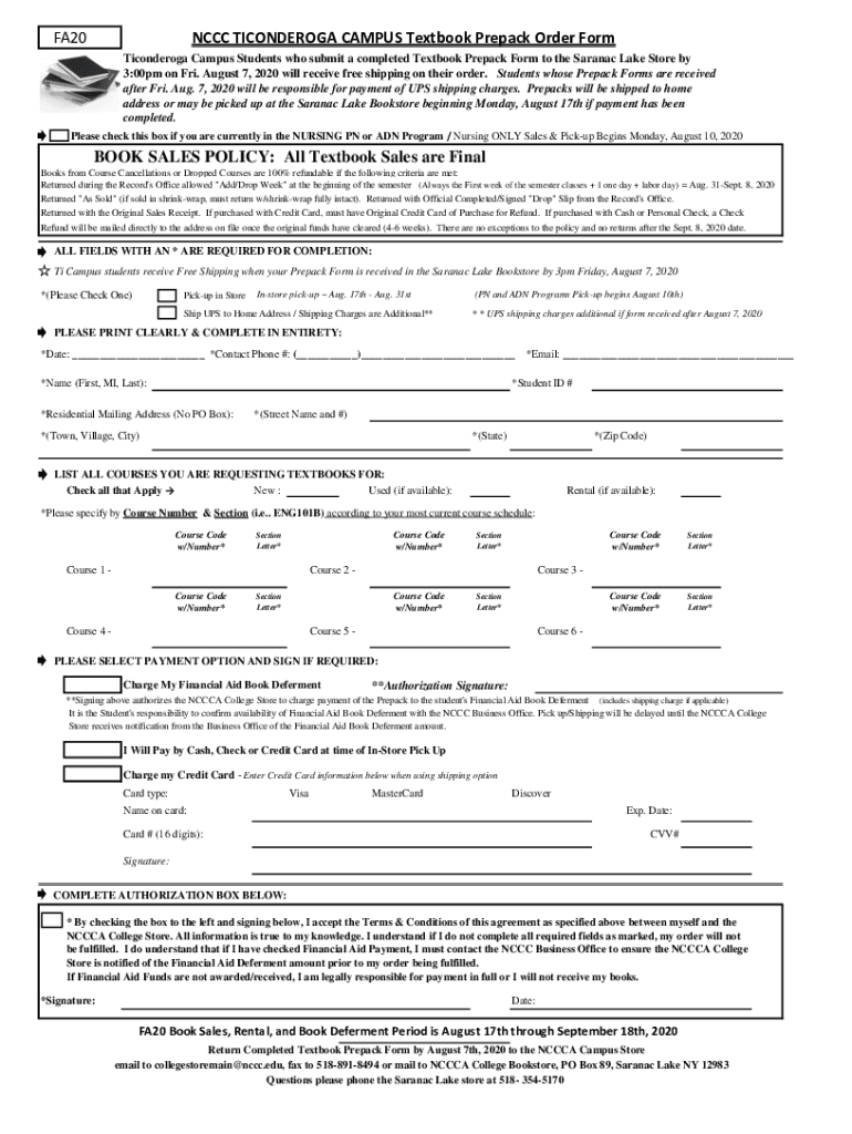 FA20NCCC TICONDEROGA CAMPUS Textbook Repack Order Form