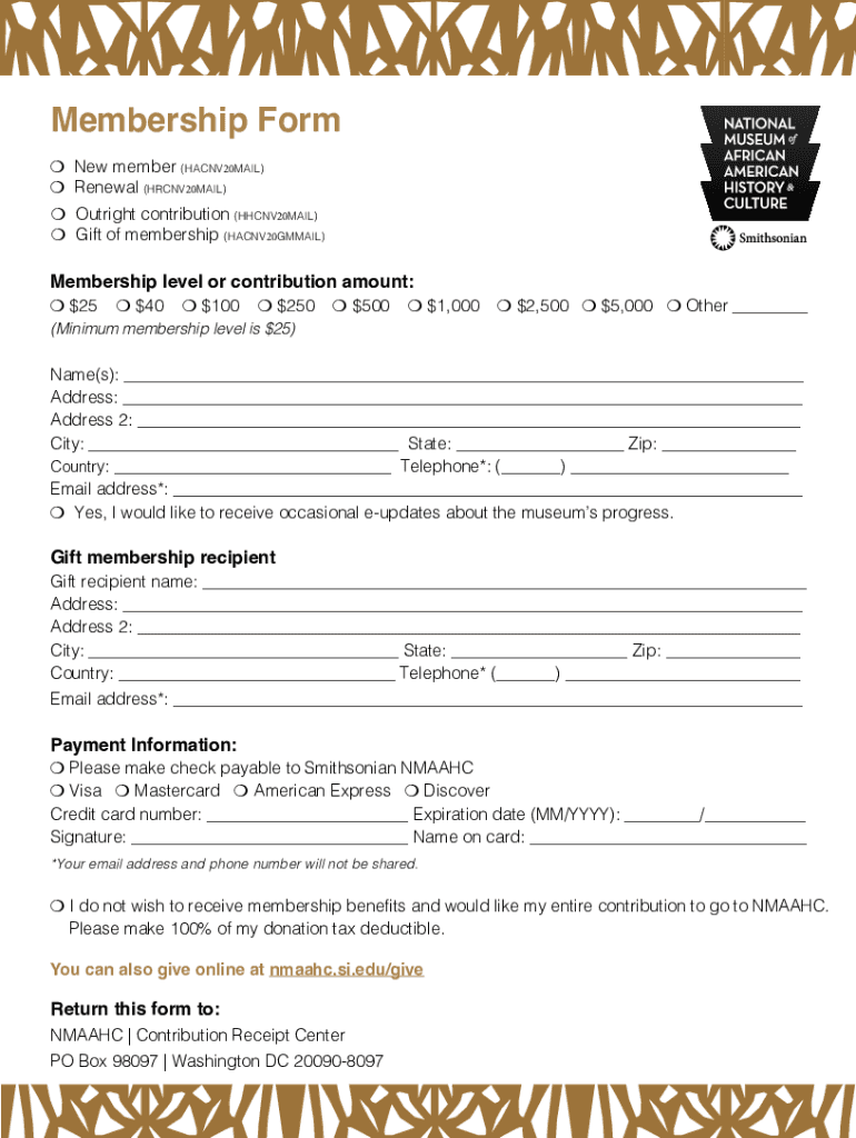 Membership Form New member (HACNV20MAIL) Renewal (HRCNV20MAIL) Outright contribution (HHCNV20MAIL) Gift of membership (HACNV20GMMAIL)Membership level or contribution amount: $$$$2540100250(Minimum