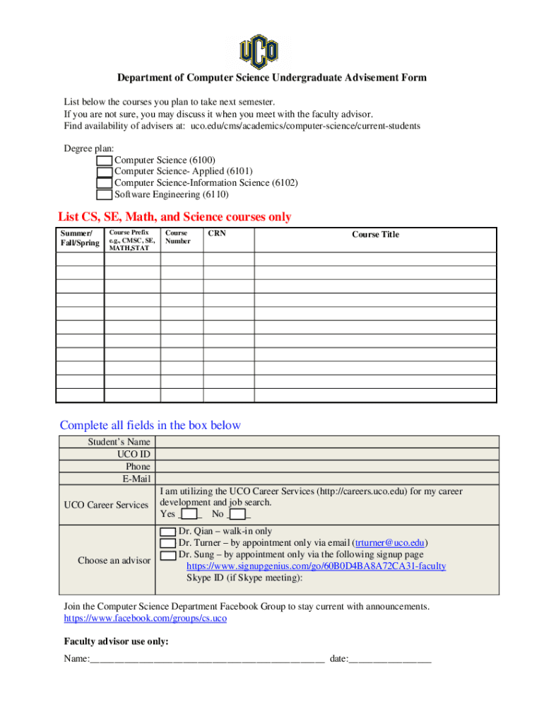 Get the free Department of Computer Science Undergraduate Advisement Form