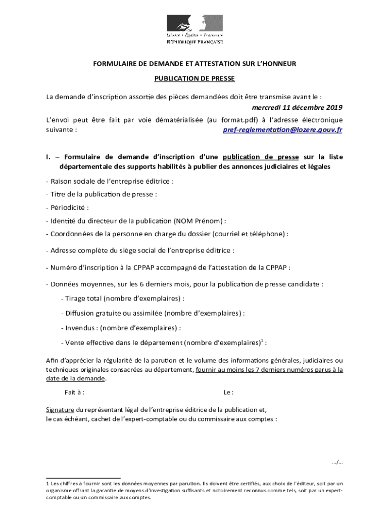 FORMULA IRE DE DEMAND ET ATTESTATION SUR LONGER PUBLICATION DE PRESS La demand din scrip on Astor e DES pics demands dot TRE transmit savant LE : Merced 11 December 2019 Envoy put TRE wait par voice