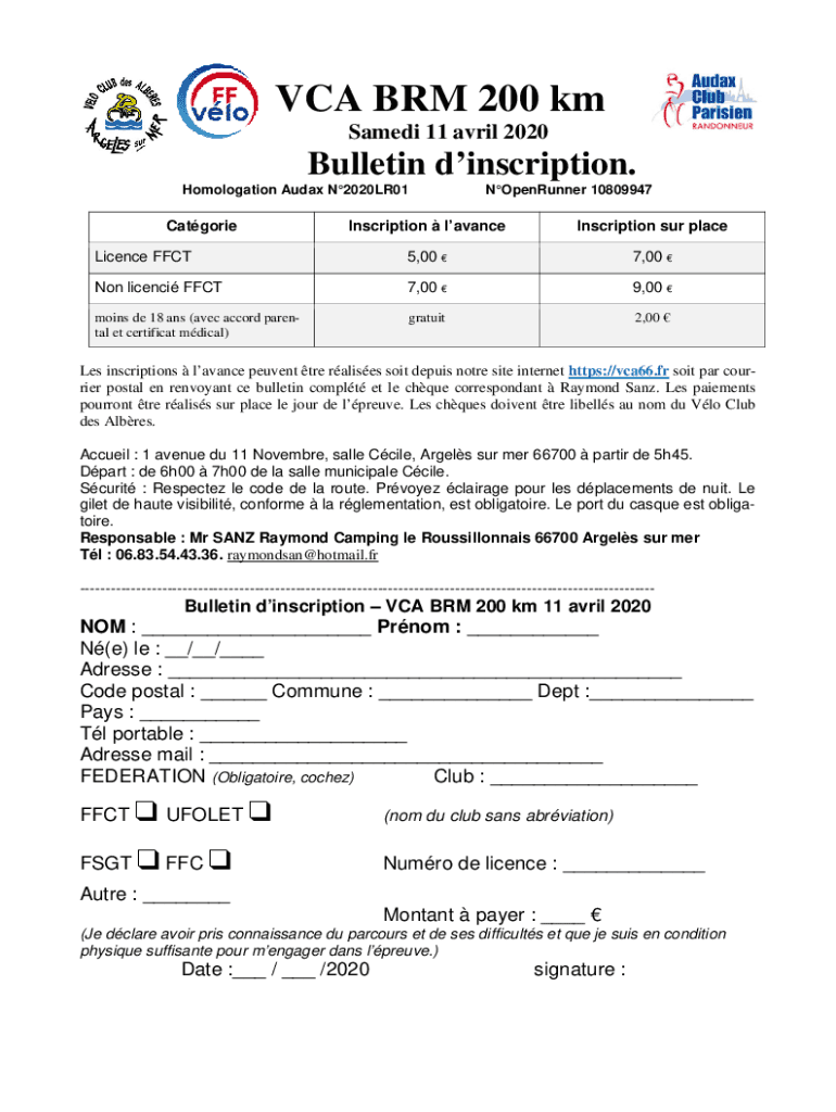 VIA BRM 200 km Named 11 April 2020Bulletin inscription. Homologation Audio N2020LR01CatgorieNOpenRunner 10809947Inscription lavanceInscription SUR placeLicence FFCT5,00 7,00 Non license FFCT7,00 9,00