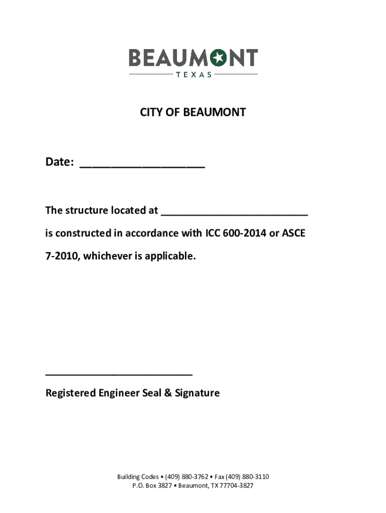 CITY OF BEAUMONTDate: The structure located at is constructed in accordance with ICC 6002014 or ACE 72010, whichever is applicable. Registered Engineer Seal & SignatureBuilding Codes (409) 8803762