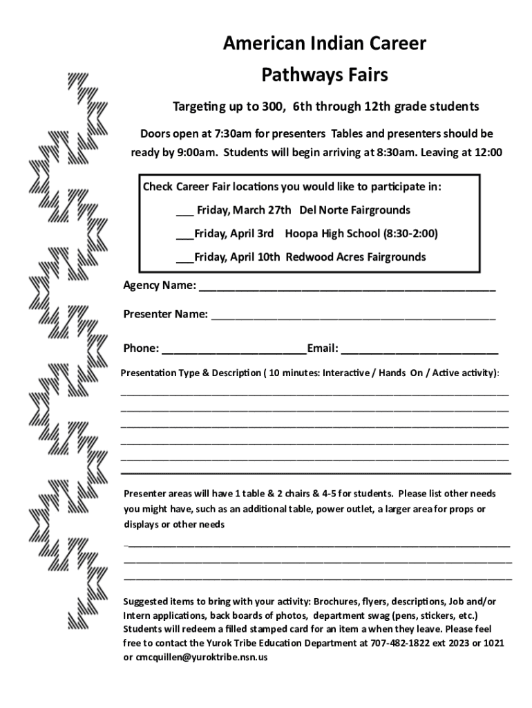 American Indian Career Pathways Fairs Targeting up to 300, 6th through 12th grade students Doors open at 7:30am for presenters Tables and presenters should be ready by 9:00am. Students will begin