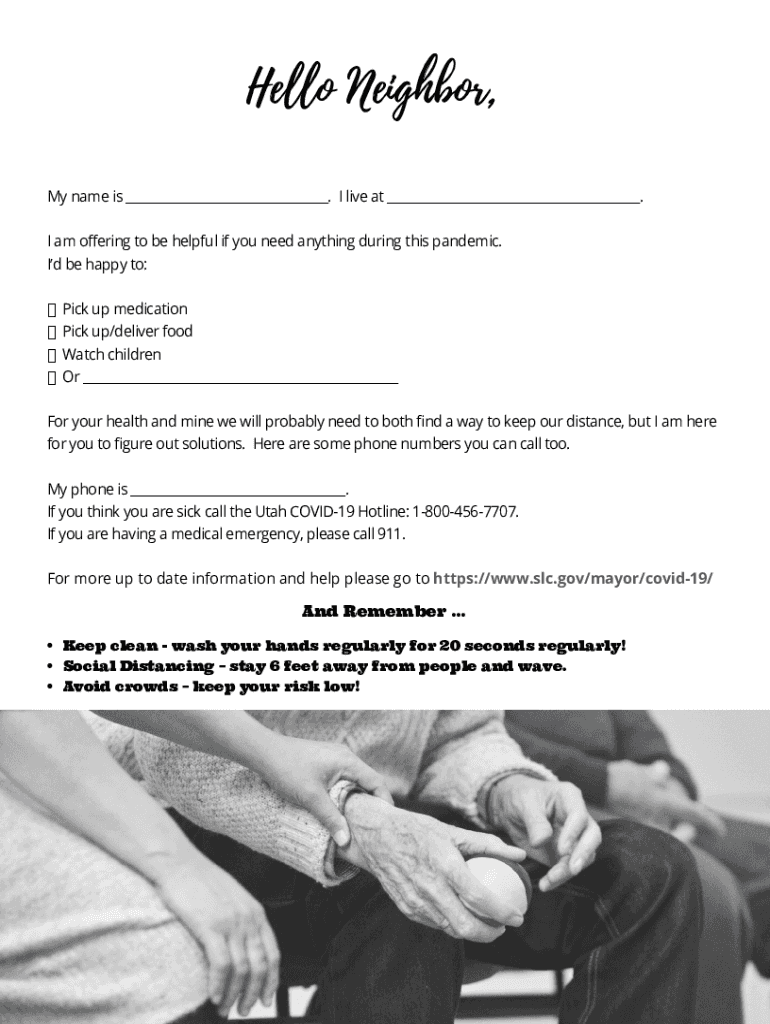 Hello Neighbor, My name is. I live at. I am offering to be helpful if you need anything during this pandemic. Furthermore, I'd be happy to: Pick up medication Pick up/deliver food Watch children Or