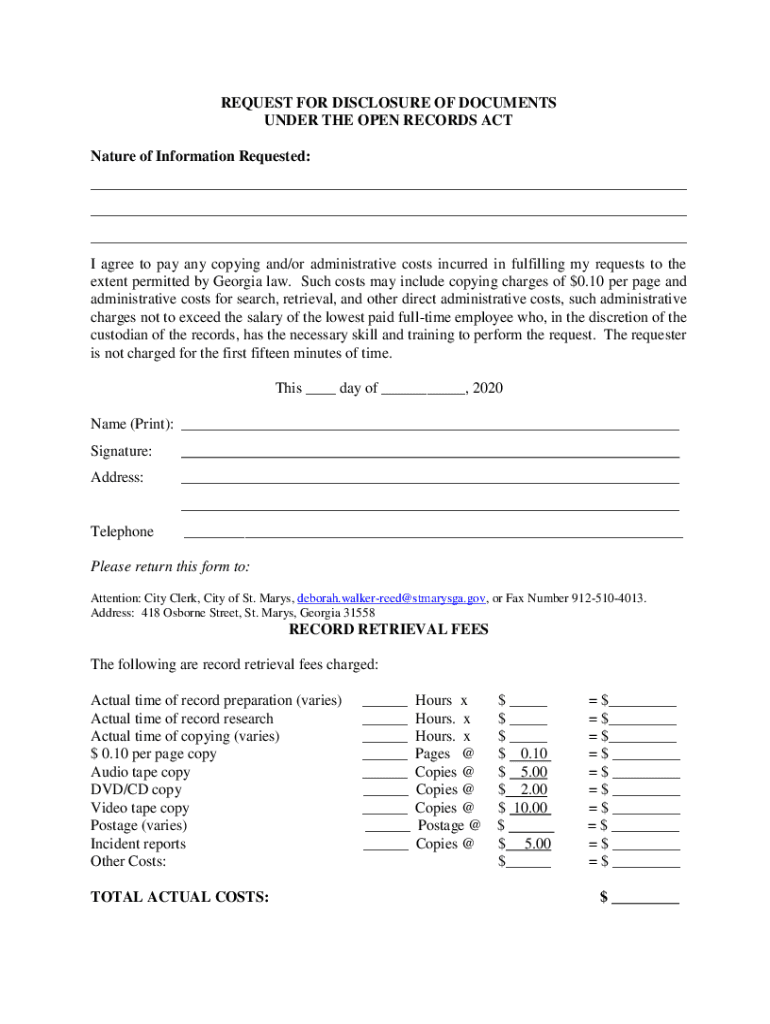 REQUEST FOR DISCLOSURE OF DOCUMENTS UNDER THE OPEN RECORDS ACT Nature of Information Requested: I agree to pay any copying and/or administrative costs incurred in fulfilling my requests to the extent