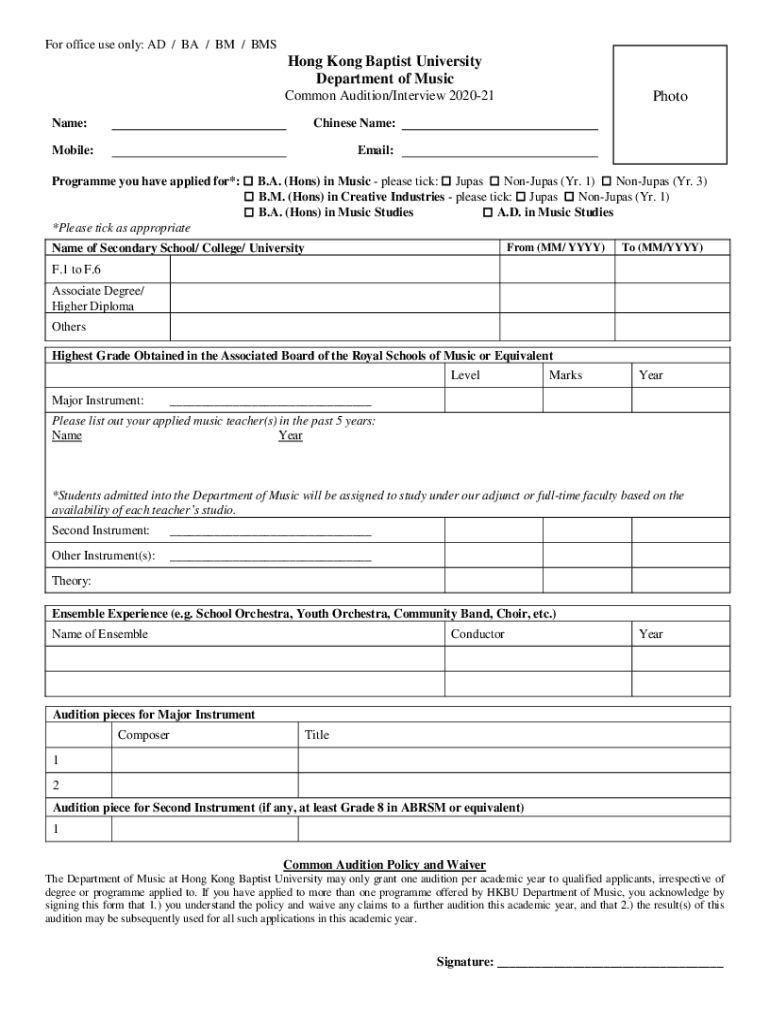 For office use only: AD / BA / BM / BMS Hong Kong Baptist University Department of Music PhotoCommon Audition/Interview 202021 Name:Chinese Name:Mobile:Email:Program you have applied for*: B.A. (Hons)