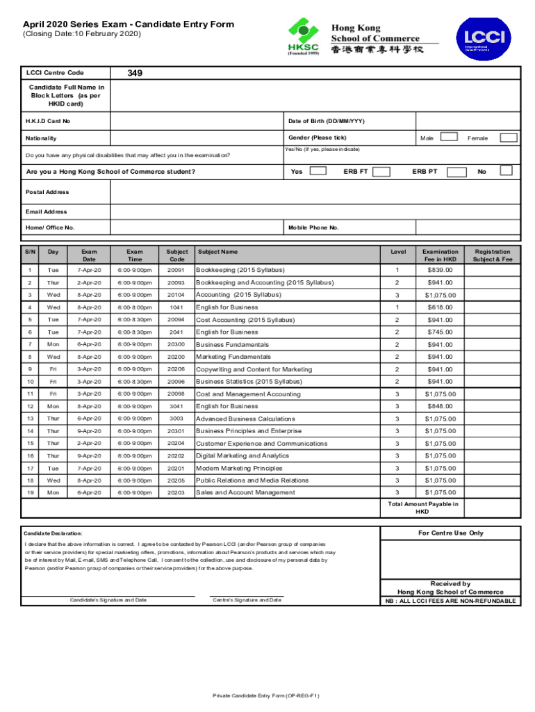April 2020 Series Exam Candidate Entry Form(Closing Date:10 February 2020)CCI Center Code349Candidate Full Name in Block Letters (as per HID card) H.K.I.D Card Notate of Birth (DD/MM/YYY) Gender (Please