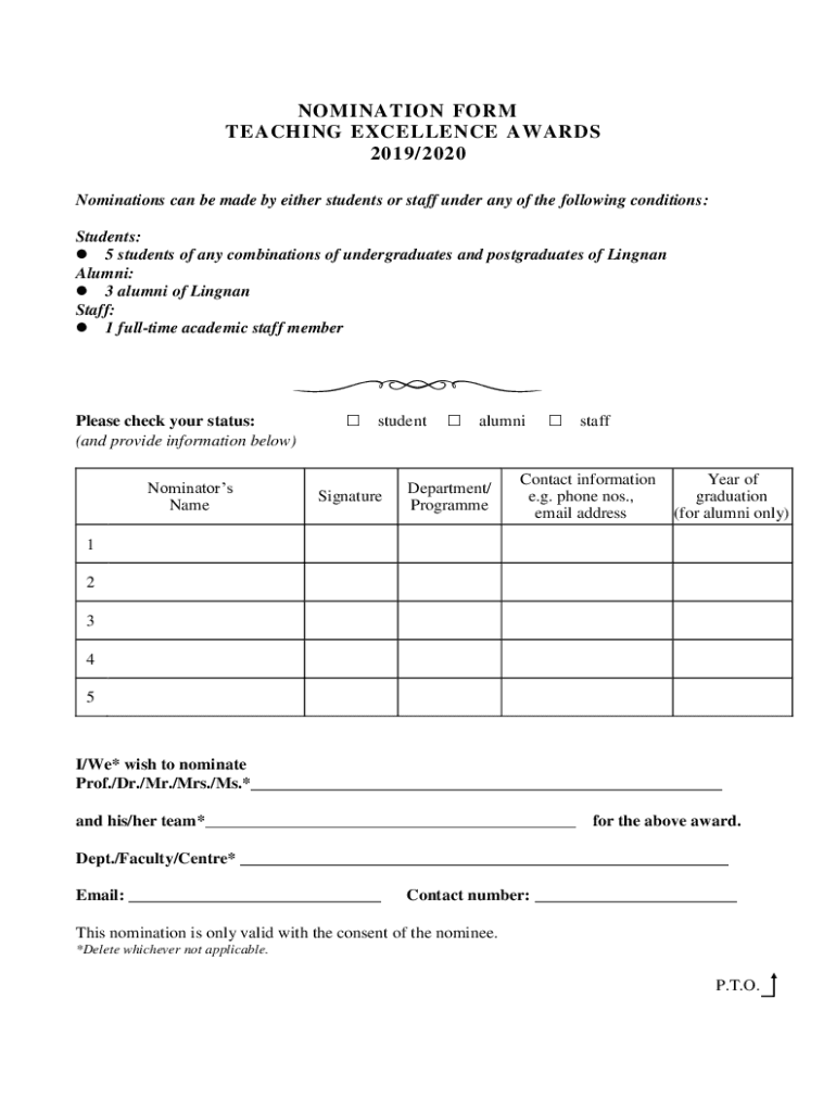 NOMINATION FORM TEACHING EXCELLENCE AWARDS 2019/2020 Nominations can be made by either students or staff under any of the following conditions: Students: 5 students of any combinations of undergraduates