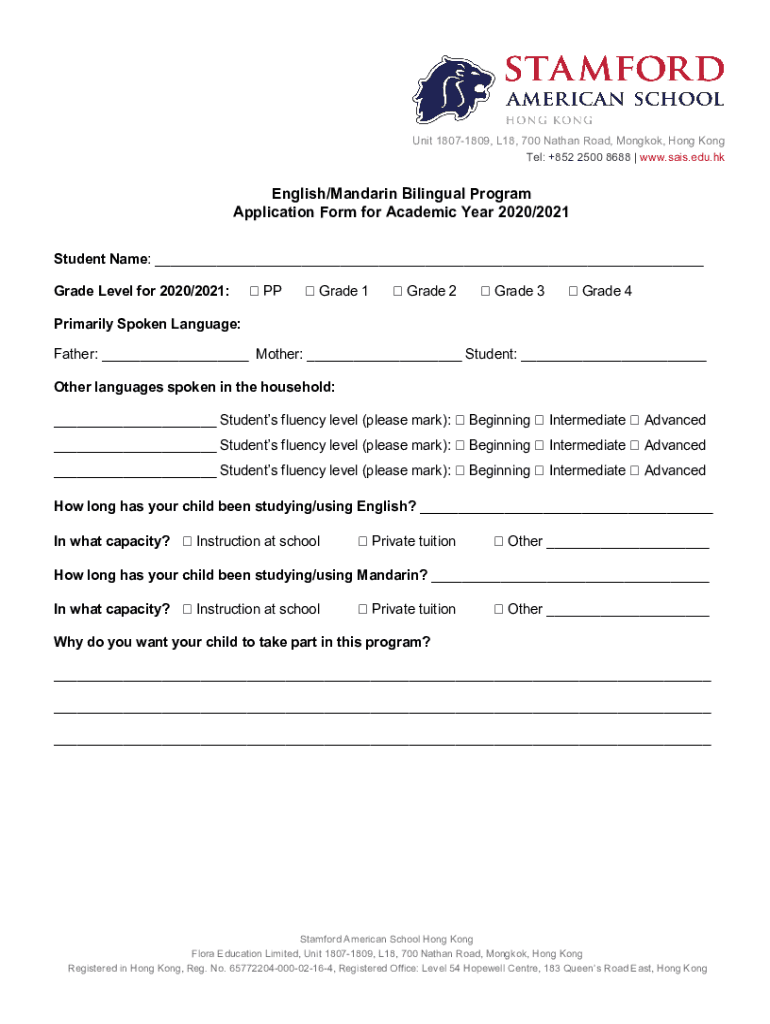 Unit 18071809, L18, 700 Nathan Road, Bangkok, Hong Kong Tel: +852 2500 8688 www.sais.edu.hkEnglish/Mandarin Bilingual Program Application Form for Academic Year 2020/2021 Student Name: Grade Level