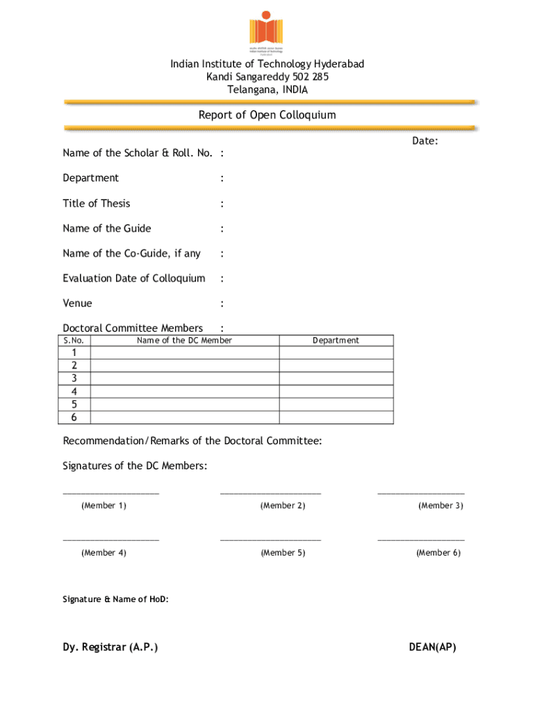 Indian Institute of Technology Hyderabad Kanji Haggardly 502 285 Telangana, Underreport of Open Colloquium Date: Name of the Scholar & Roll. No. Department:Title of Thesis:Name of the Guide:Name