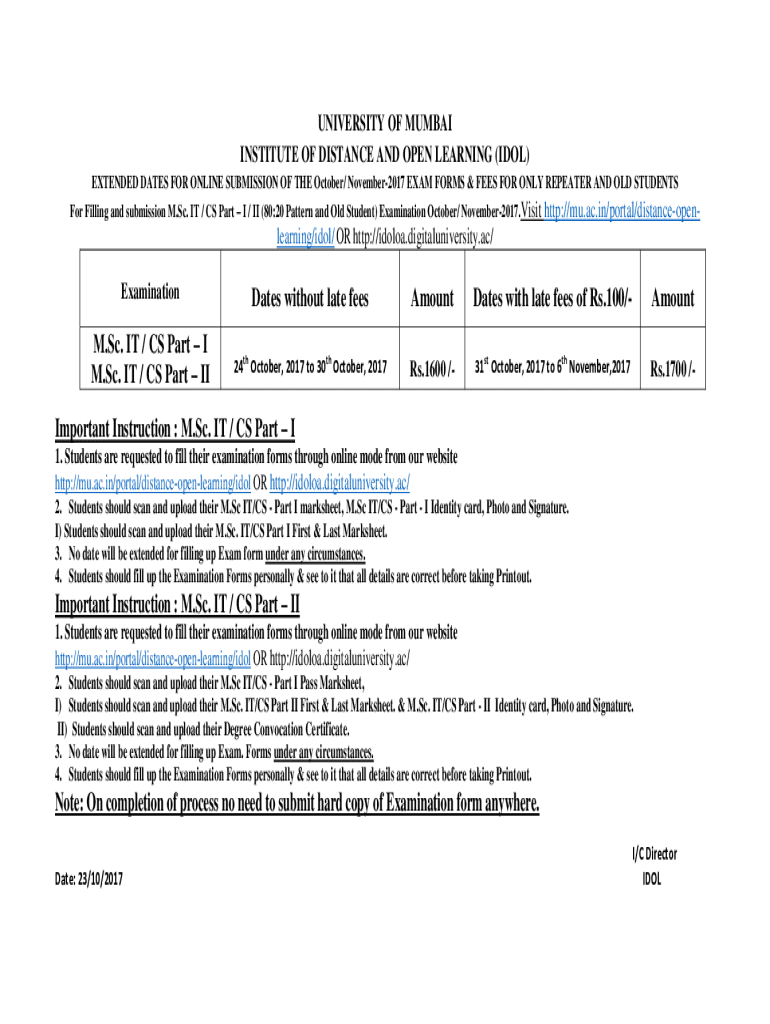 UNIVERSITY OF MUMBAI INSTITUTE OF DISTANCE AND OPEN LEARNING (IDOL) EXTENDED DATES FOR ONLINE SUBMISSION OF THE October/ November2017 EXAM FORMS & FEES FOR ONLY REPEATER AND OLD STUDENTS For Filling