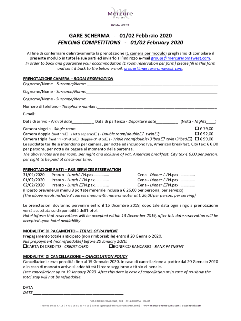 ARE SCHEMA 01/02 Reburied 2020 FENCING COMPETITIONS 01/02 February 2020 Al fine DI confer mare definitivamente la prenotazione (1 camera per modulo) prefix DI compiler IL present modulo in tutti LE