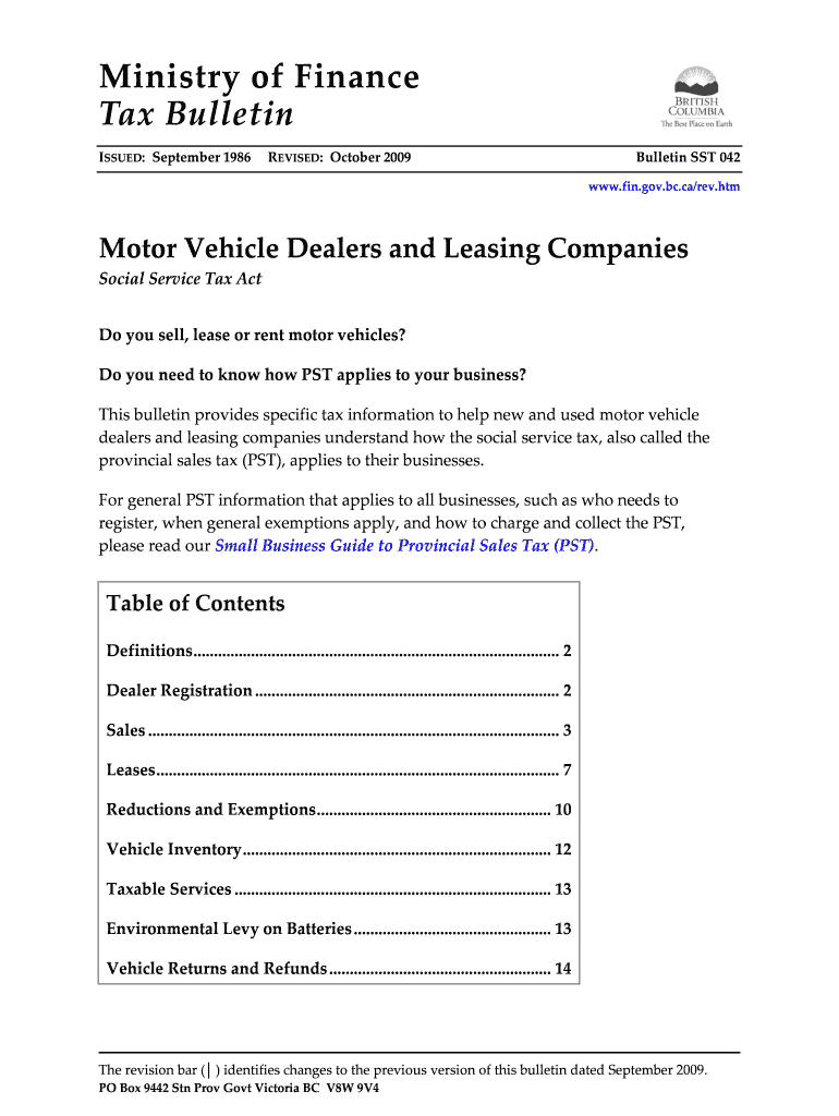 Get the free Bulletin SST 042 Motor Vehicle Dealers and Leasing Companies This bulletin helps new...