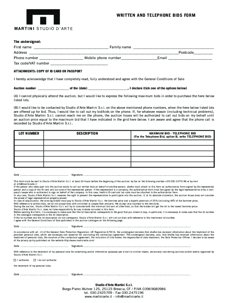 WRITTEN AND TELEPHONE BIDS FORM M A R T I N I S T U D I O D A RT E The undersigned: First name Family name Address Postcode Phone number Mobile phone number Email Tax code/VAT number ATTACHMENTS: