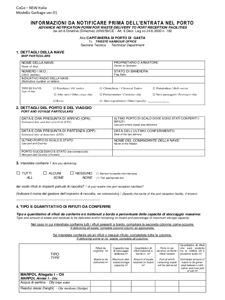 Come NSW Italia Model lo Garbage very.01INFORMAZIONI DA PONTIFICATE PRIME DELLENTRATA NEW PORTO ADVANCE NOTIFICATION FORM FOR WASTE DELIVERY TO PORT RECEPTION FACILITIES (ex art.6 Directive (Directive)