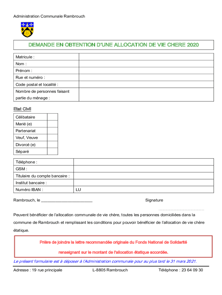 Administration Communal RambrouchDEMANDE EN ATTENTION DUNE ALLOCATION DE VIE THERE 2020 Matriculate : Not : Prom : Rue et humor : Code postal ET locality : Hombre DE personnel faint parties Du manage
