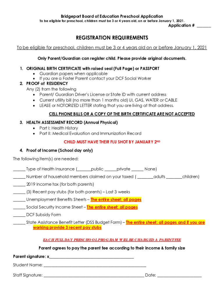 Bridgeport Board of Education Preschool Application be eligible for preschool, children must be 3 or 4 years old, on or before January 1, 2021. Application # REGISTRATION REQUIREMENTS To be eligible