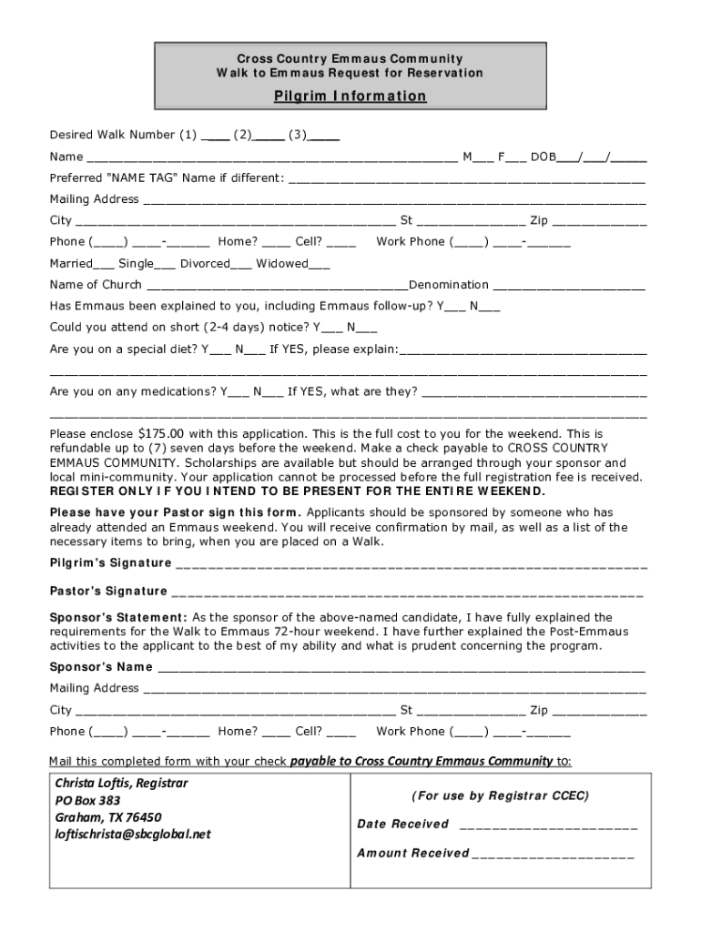 Information required on the Emmaus Walk application typically includes participant's name, address, phone number, email, religious background, and any special needs.
