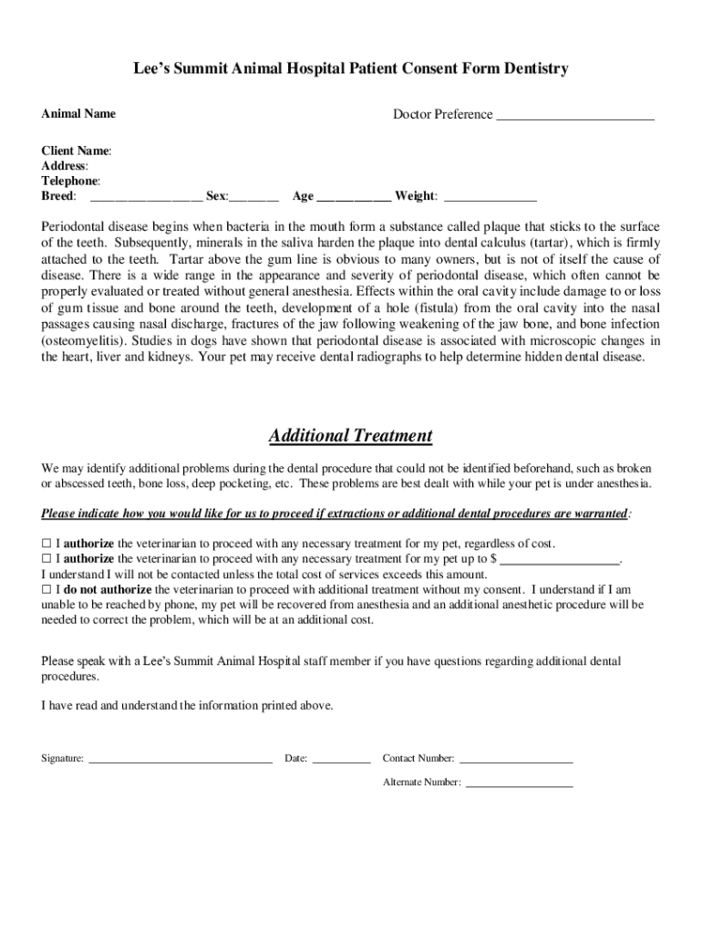 Lees Summit Animal Hospital Patient Consent Form Dentistry Animal Name Doctor Preference Client Name: Address: Telephone: Breed: Sex: Age Weight:Periodontal disease begins when bacteria in the mouth
