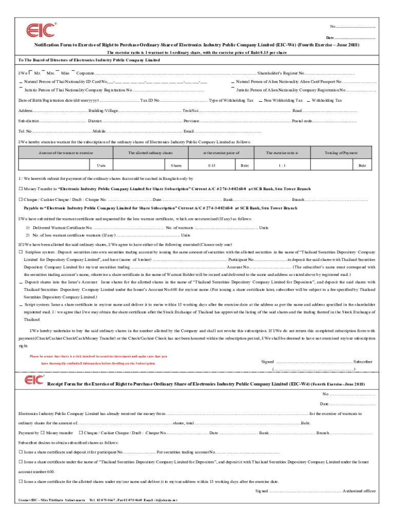 No Date. Notification Form to Exercise of Right to Purchase Ordinary Share of Electronics Industry Public Company Limited (EICW4) (Fourth Exercise June 2018) The exercise ratio is 1 warrant to 1 ordinary