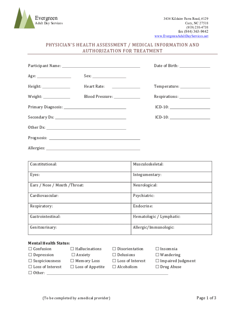 www.EvergreenAdultDayServices.netPHYSICIAN\'S HEALTH ASSESSMENT / MEDICAL INFORMATION AUTHORIZATION FOR TREATMENTParticipant Name:Date of Birth:Age:Sex:Height:Heart Rate:Temperature:Weight:Blood Pressure:Respirations:Primary Diagnosis:ICD10:Secondary DX:ICD10:Other DX: